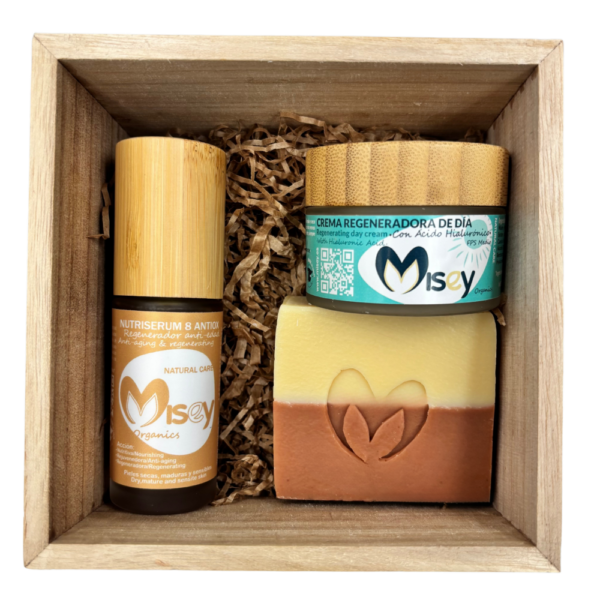 Rutina facial de mañana en 3 pasos para piel mixta, seca y madura: limpieza con jabón artesano (a elegir), nutrición antioxidante con Nutriserum 8 Antiox, y sella la piel con Crema Regeneradora de Día con Ácido Hialurónico y FPS 15–20 para hidratar y proteger.